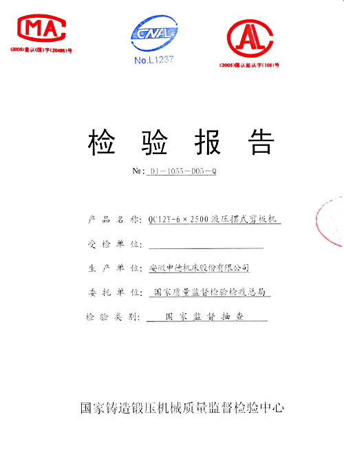 根據(jù)2006年第4季度剪板機國家監(jiān)督抽查實施方案,受國家質量監(jiān)督檢驗檢疫總局委托,國家鑄造鍛壓機械質量監(jiān)督檢驗中心,于2006年9月23日,對本公司產中德牌液壓擺式剪板機進行了現(xiàn)場檢驗。近日,我公司收到了本次抽檢的結果通知單及檢驗報告,結果為:合格。